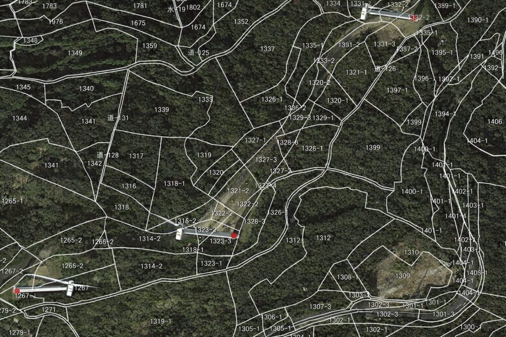 指定いただいたエリア(点・ポリゴン・住所指定など)をもとに、該当地域の筆データを作成し、地番・地権者情報を整理します。