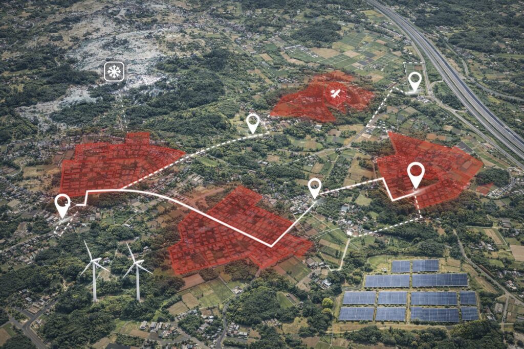 複数地点の比較や候補地検討に活用できる基盤データを構築し、規制区域やインフラ、筆データなど他の空間情報との重ね合わせにも対応。